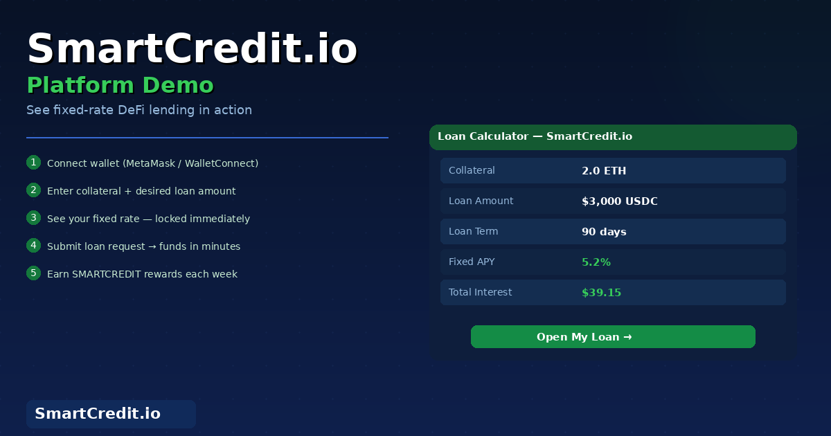 SmartCredit.io ETH mainnet launch: Non-custodial DeFi lending now live. Features: (1) Fixed interest rates – 8-15% APY (vs Aave/Compound variable 3-35%), (2) Fixed terms – 30, 90, 180, 365 day loans, (3) 2x smaller collateral – 150% ratio vs 300% on other platforms = access 2x more capital. How it works: deposit ETH/BTC/stablecoins, borrow against collateral, repay to unlock. No KYC, no intermediaries, you control private keys. Ethereum mainnet = maximum security + composability with other DeFi. Launch stats: 1,000+ early users, $500K TVL (week 1). Audited smart contracts, transparent on-chain. Join DeFi fixed income revolution. Visit https://devaiweb.smartcredit.io